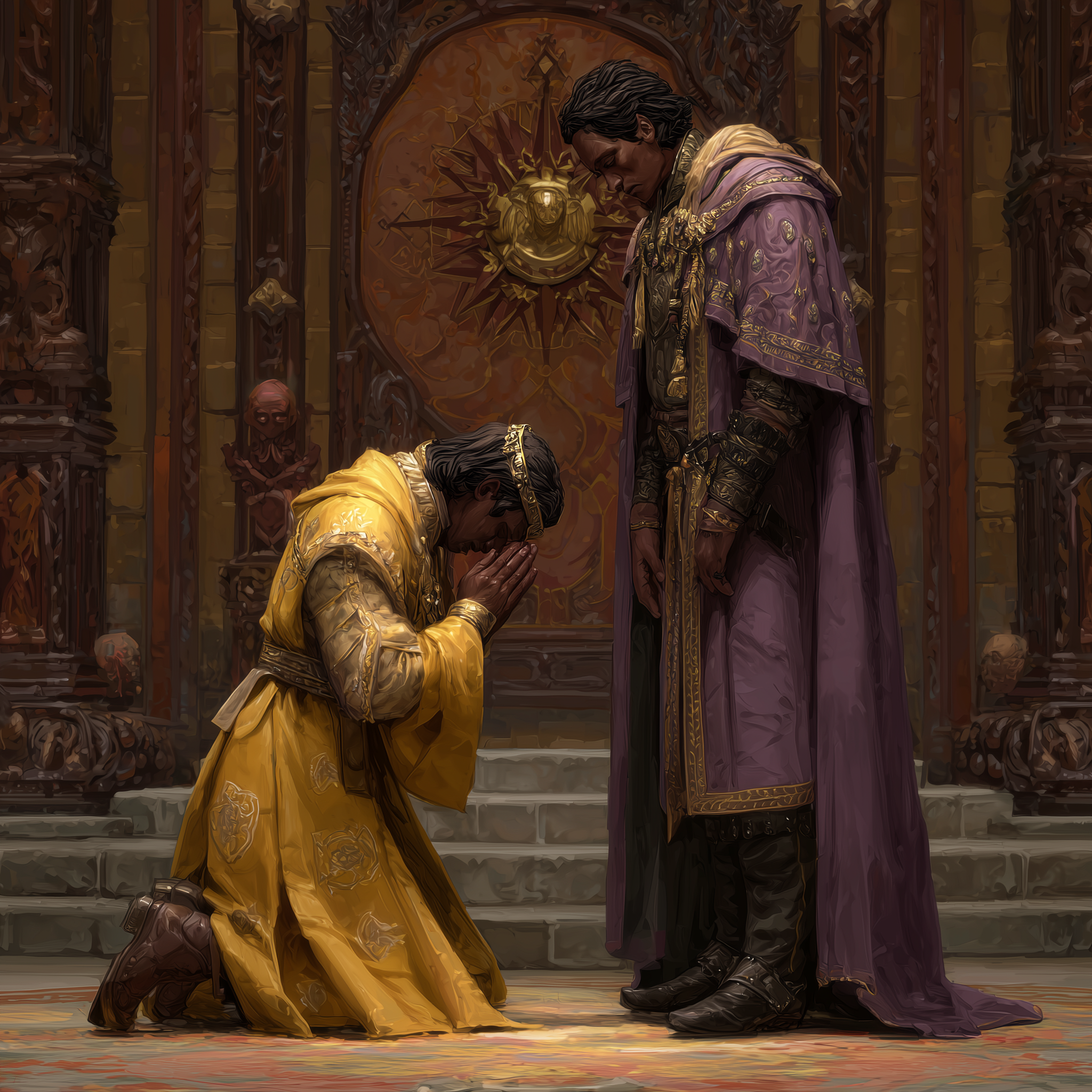 Much as a peasant is going to pray to the Nine to safeguard his/her house, a king is going to pray to the Nine to safeguard his entire land and all the people on it.   But beyond appeasing the Nine themselves, kings and queens have to appease dozens if not hundreds of priests and priestesses.   Small religious rituals are usually performed on the personal or family level, medium level rituals are performed at the community level, and large rituals are performed at the national level.   Priests and priestesses conduct the rituals, but they need support to do so. Kings and queens are usually the ones providing the resources for large veneration rituals for the Nine, mid-level nobles like Barons and Counts usually provide similar support for community level rituals.